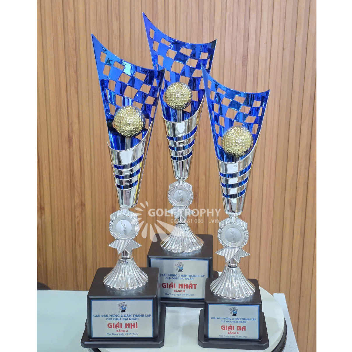 – Cúp Golf kim loại màu bạch kim phối xanh dương