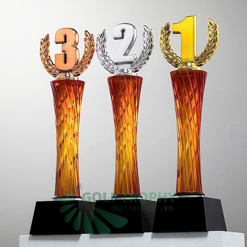 – Cúp pha lê thân màu đỏ– Chất liệu: Pha lê – Màu sắc: hạng nhất màu vàng,hạng nhì màu bạc,hạng ba màu đồng