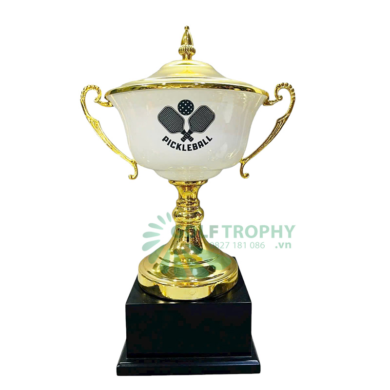 Cúp pickleball kim loại màu vàng – trắng (gắn được đỉnh pickleball) – Chất liệu: kim loại– Màu sắc: vàng - trắng