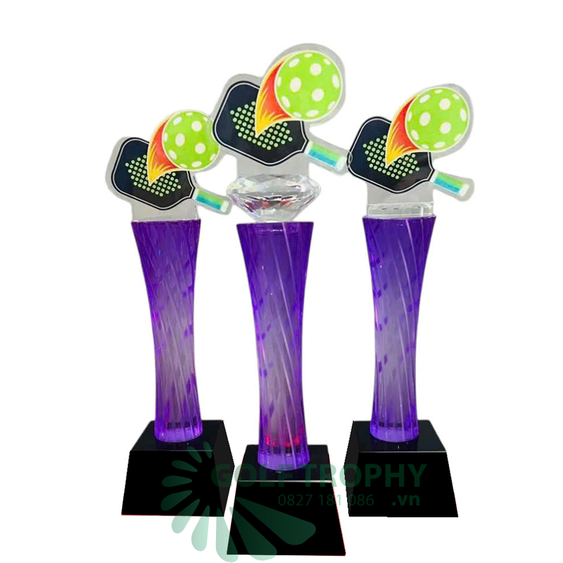 – Cúp Pickleball pha lê thân màu tím gắn đỉnh pickleball pha lê– Chất liệu: Pha lê – Màu sắc: tím